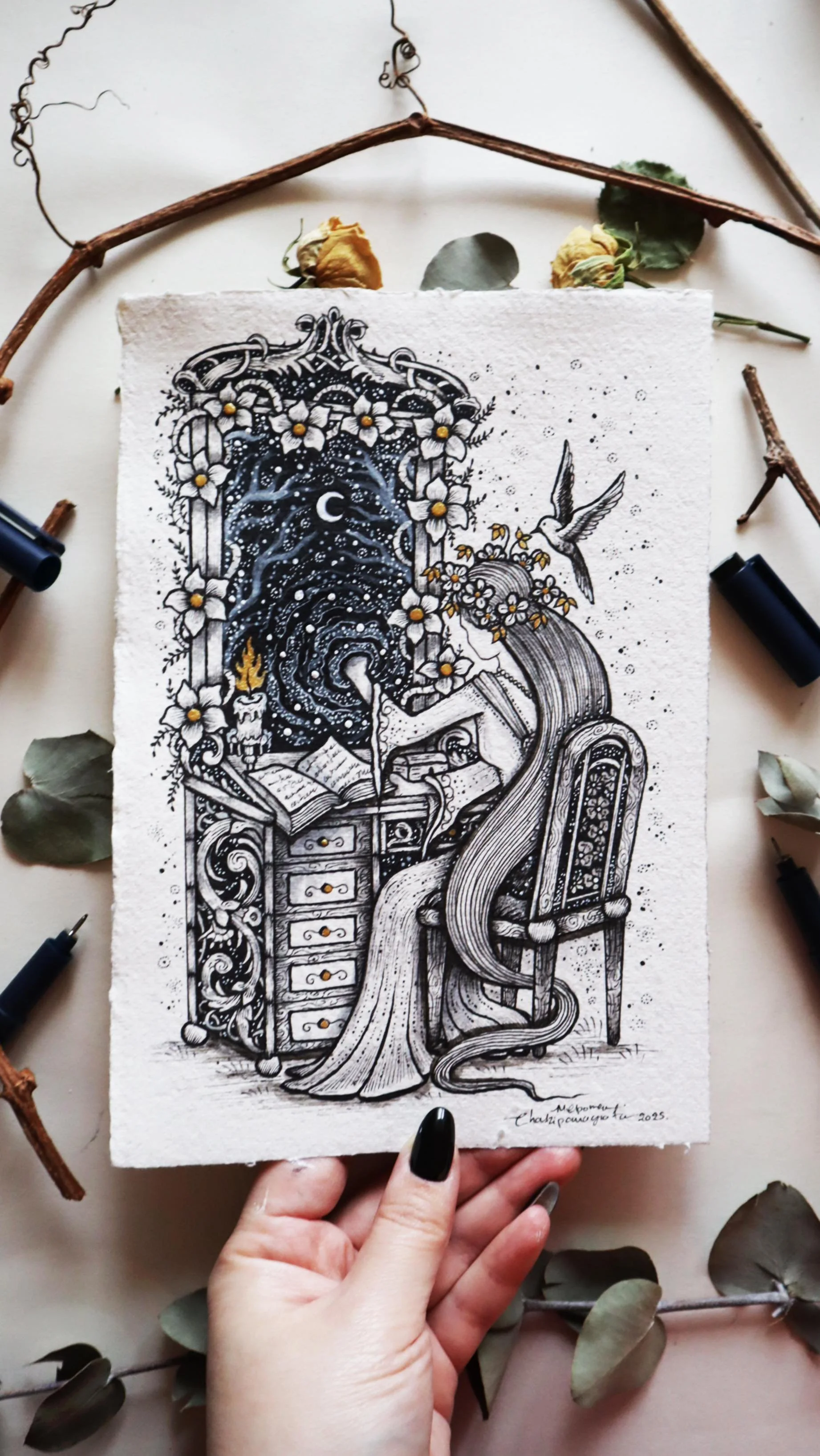 Melpomeni is an independent illustrator and Graphic Designer working professionally for over 10 years, specializing in detailed illustration works, typography, editorial works, book covers and more. Her work is characterized by intricate details and a harmonious fusion of natural elements with imaginative concepts. With a profound appreciation for the natural world, often weaving flora and fauna into fantastical scenes.